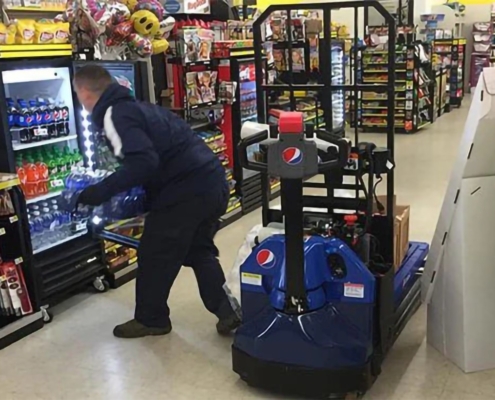 Our 4,000lb capacity electric pallet truck has been developed from the ground up to meet the unique demands of local delivery applications. The D40 is thus very compact in design yet it has the power to perform from warehouse to store, both inside or outdoors.